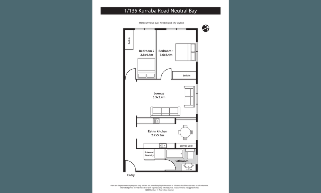 Lounge & dining area Stylish eat-in kitchen with stainless steel appliances Two generous double bedrooms with built-ins Internal Laundry Close walk to Kurraba St, ferry wharf Stunning Harbour-side garden meandering to waters edge
